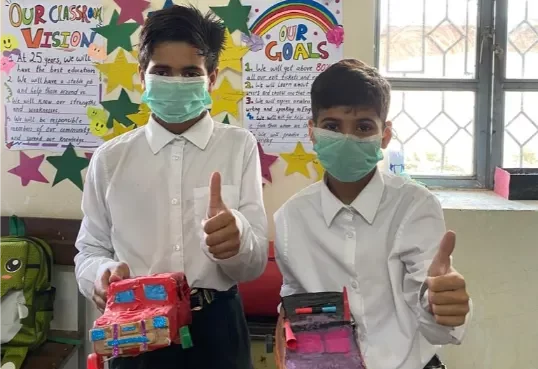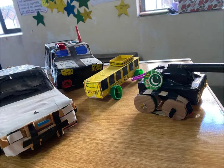 Community waste disposal was identified by the learners as a pressing issue- provision was severely limited and rubbish was burnt, buried or discarded near the school leading to ecosystem disruption, increases in air pollution, greenhouse gas emissions and little to no recycling was taking place. This led the teachers to introduce the idea of the four Rs to students – refuse, reduce, reuse and recycle. One student, Abdullah, encountered an internal conflict as he wanted to make toy cars that were fully functional but was also deeply concerned about the environmental consequences of his actions. To solve this issue he decided to reuse discarded objects to make a ‘Franken Car’. He collected waste materials from the community and produced a toy car that is now enjoyed by the children in his class.